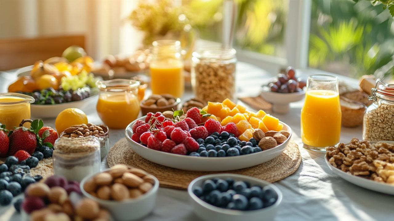 Le petit-déjeuner en chrononutrition se distingue radicalement des recommandations traditionnelles en privilégiant les protéines et les bonnes graisses. Ce repas, à prendre entre sept et neuf heures du matin, doit être copieux pour fournir l'énergie nécessaire à la matinée. On y retrouve des œufs, du fromage riche en protéines comme l'emmental, le comté ou le cottage cheese, accompagnés de pain complet ou de céréales sans sucre ajouté. Cette composition permet de stimuler l'organisme efficacement et d'assurer une satiété durable jusqu'au repas suivant. Les lipides consommés le matin sont mieux métabolisés et contribuent à l'équilibre hormonal, notamment la production de dopamine qui favorise la concentration et l'énergie mentale.